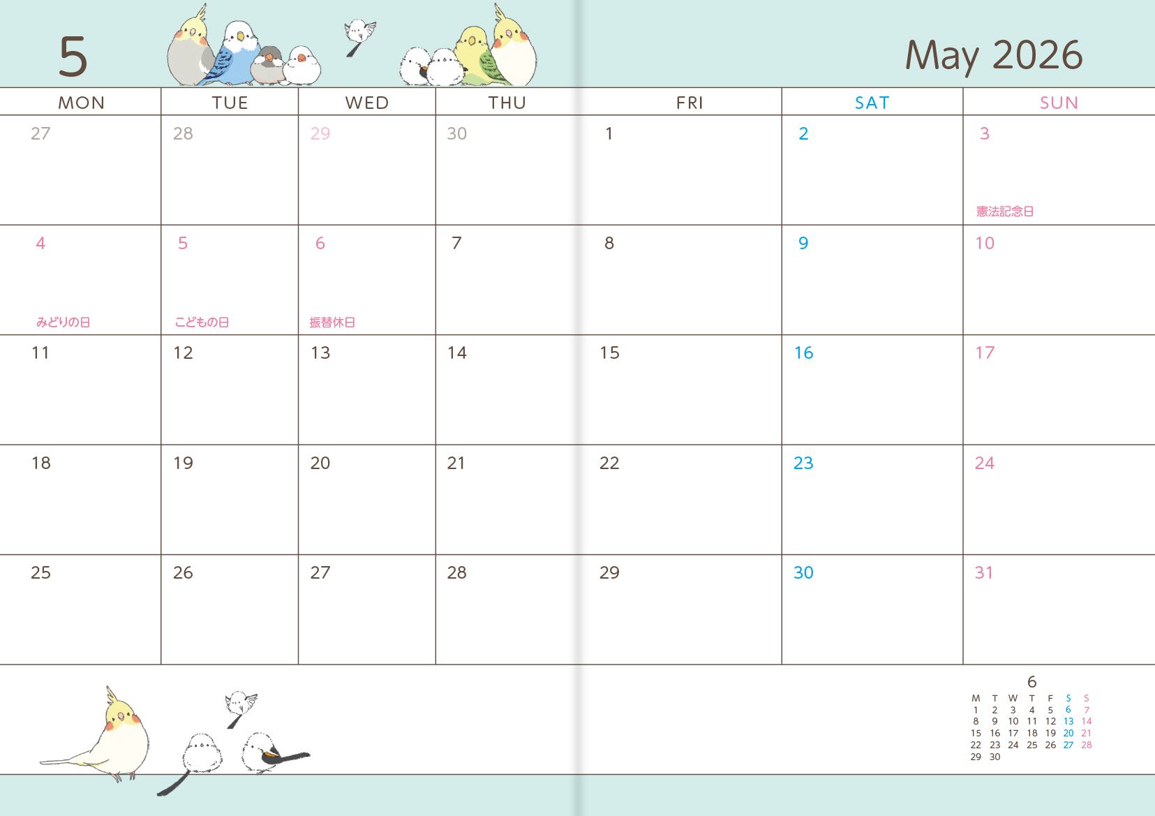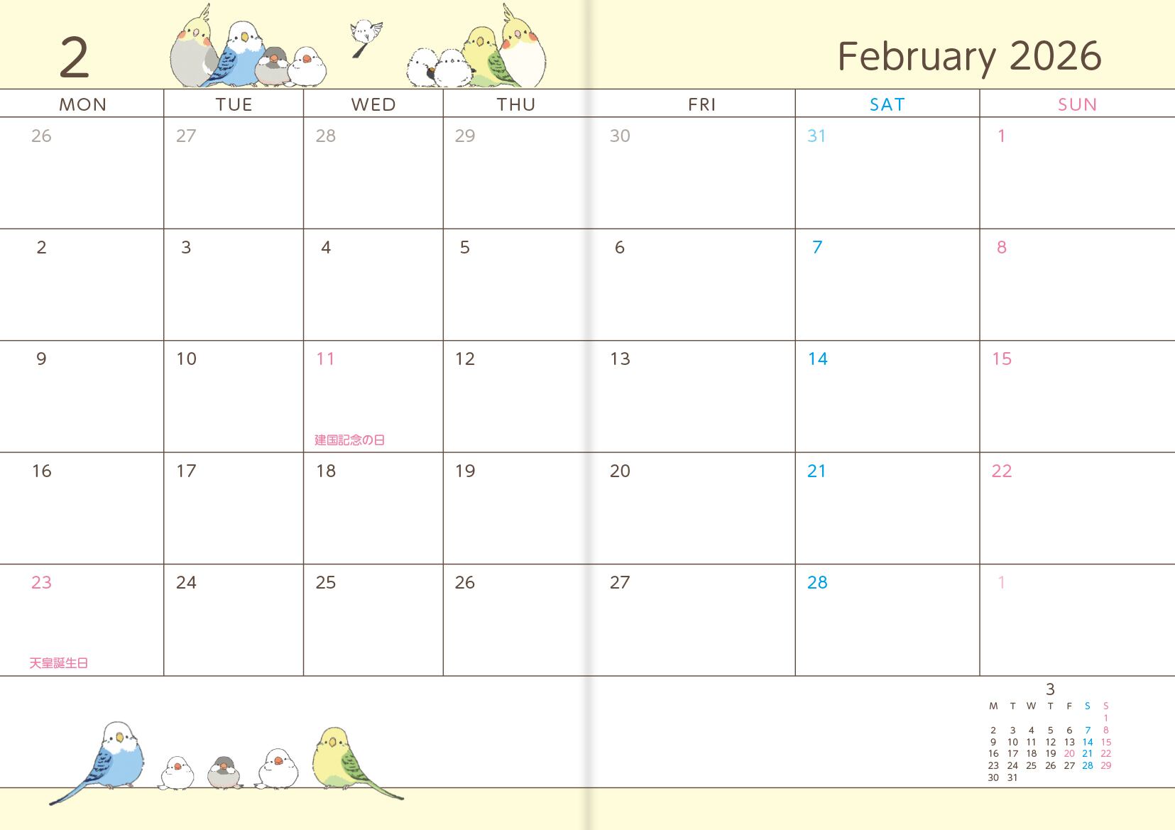 ぴよ手帖シリーズ シマエナガのインコと文鳥がいっぱい の2026年版ダイアリーです。